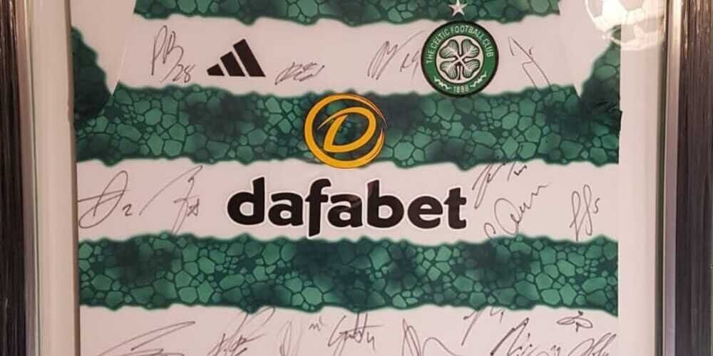 Up for Raffle via MyClubHub is a signed framed Celtic top from season 2023/24.